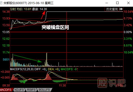 如圖所示,2015年6月10日開盤后,宋都股份(600077)持續(xù)橫盤整理。在橫盤整理過程中,股價(jià)的波動(dòng)幅度越來越小,同時(shí)成交量也持續(xù)萎縮。這樣的形態(tài)說明市場上的多空雙方力量持續(xù)僵持,并且在僵持的過程中,雙方都被大量消耗。