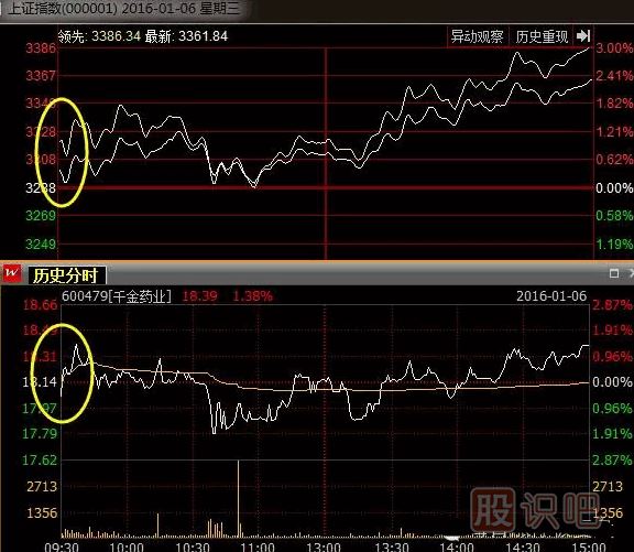 具體來(lái)看看當(dāng)天的K線圖。上圖是千金藥業(yè)的走勢(shì),下圖是上證指數(shù)的走勢(shì)。個(gè)股明顯的弱于大盤。