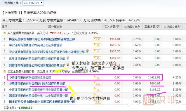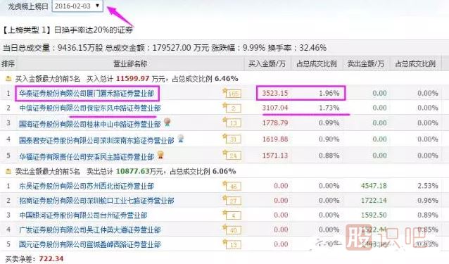 龍虎榜,2016年2月4日,賣方營業(yè)部。“華泰浙江分公司”、“華泰廈門廈禾路”“中信保定東風中路”全部出貨,買方零散的營業(yè)部都是接盤的。華泰浙江分公司這一筆,兩個交易日一進一出至少賺了1.5個漲停板。廈禾路和中信保定東風中路也有的大肉吃。