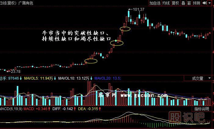 三種缺口:突破性缺口、持續(xù)性缺口和竭盡性缺口,其實(shí)就是股價(jià)反轉(zhuǎn)過(guò)程中持續(xù)出現(xiàn)的,三種股價(jià)加速見(jiàn)頂(或者見(jiàn)底)的無(wú)交易狀態(tài)的價(jià)格區(qū)域。熊市行情見(jiàn)底的時(shí)候,個(gè)股下跌的趨勢(shì)也會(huì)同步減緩,并且在指數(shù)拉升的第一時(shí)間里出現(xiàn)跳空上攻的缺口,就是熊市向牛市轉(zhuǎn)換的突破性缺口。而牛市行情見(jiàn)頂?shù)暮笃?,個(gè)股出現(xiàn)無(wú)量滯漲的走勢(shì)。一旦指數(shù)出現(xiàn)破位下跌的走勢(shì),個(gè)股也會(huì)同時(shí)跳空下跌,形成牛市行情向熊市行情轉(zhuǎn)變的跳空缺口,這就是我們所說(shuō)的股價(jià)向熊市行情轉(zhuǎn)變的突破性缺口。