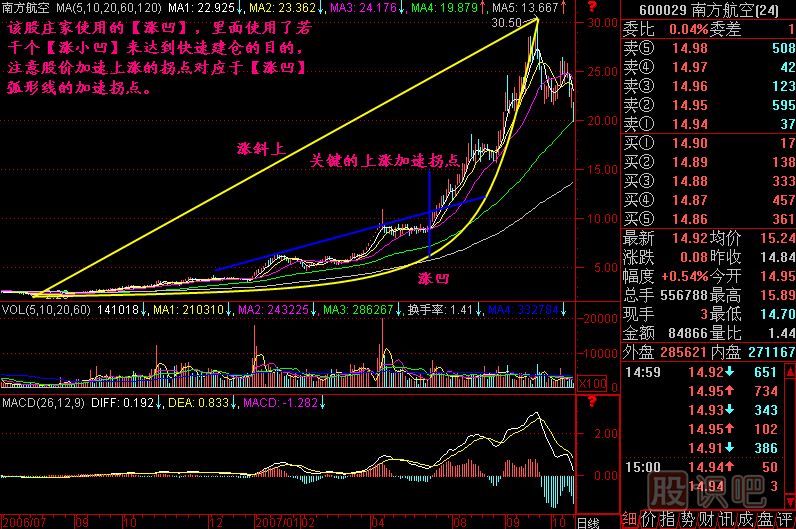 需要強調(diào)的是,其中股價運行在漲凹這條線路上的時候,股價上漲幅度和速度最快的階段,就是股價突破建倉區(qū)間高點連線和弧形線加速拐點的那個區(qū)間,在那里買進股票就是性價比最高的區(qū)間,可以在較短的時間內(nèi)獲得豐厚的利潤。