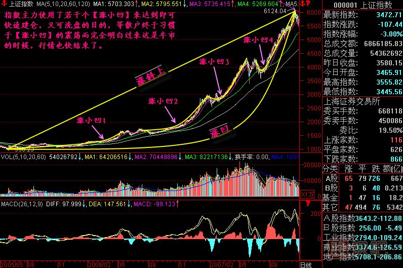 但在具體的運用上,主力不會那么做,如果主力嚴格按照漲拱、漲斜上或漲凹的線路施工的話,那個線路就畫得太明白了,哪個散戶看不懂啊?所以在具體的運用上,主力會不斷的變換花樣,在大體上沿著原型方向運行的情況下,其中會使用若干的漲小拱、漲小凹等等模式來復雜化前進路線,只有這樣才能不斷給散戶制造心理障礙,否則散戶就真的都變成螞蝗了。