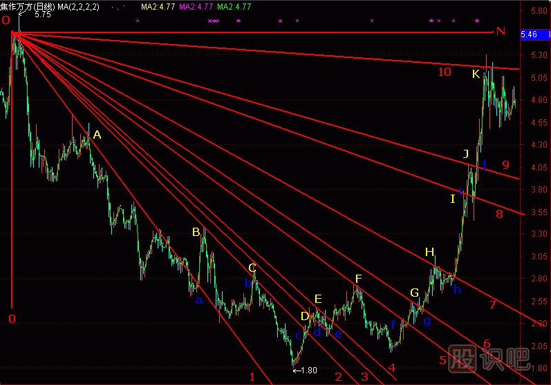 3、(圖288-1)中第二個(gè)股價(jià)高點(diǎn)是股價(jià)下跌過(guò)程中的“B”,然后與“O”點(diǎn)作第2條直線。依此類推,畫出N條直線(第N條直線等于水平線);