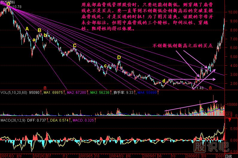 “扇骨線理論”與“會(huì)創(chuàng)新低還有新低”、“會(huì)創(chuàng)新高還有新高”這兩個(gè)技術(shù)結(jié)合起來(lái)使用,判定股價(jià)的頭部和底部的準(zhǔn)確性更高。