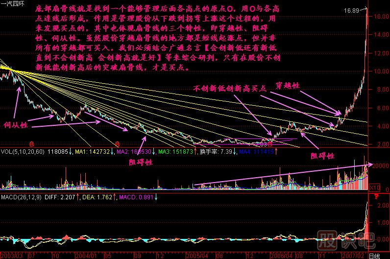 3、扇骨線的阻礙性:股價(jià)下跌過(guò)程中的每一個(gè)回檔低點(diǎn),都很難跌破過(guò)前一條扇骨線。扇骨線有阻礙下跌回檔的特性。這對(duì)我們把握回檔低點(diǎn),逢低買進(jìn)很有幫助。