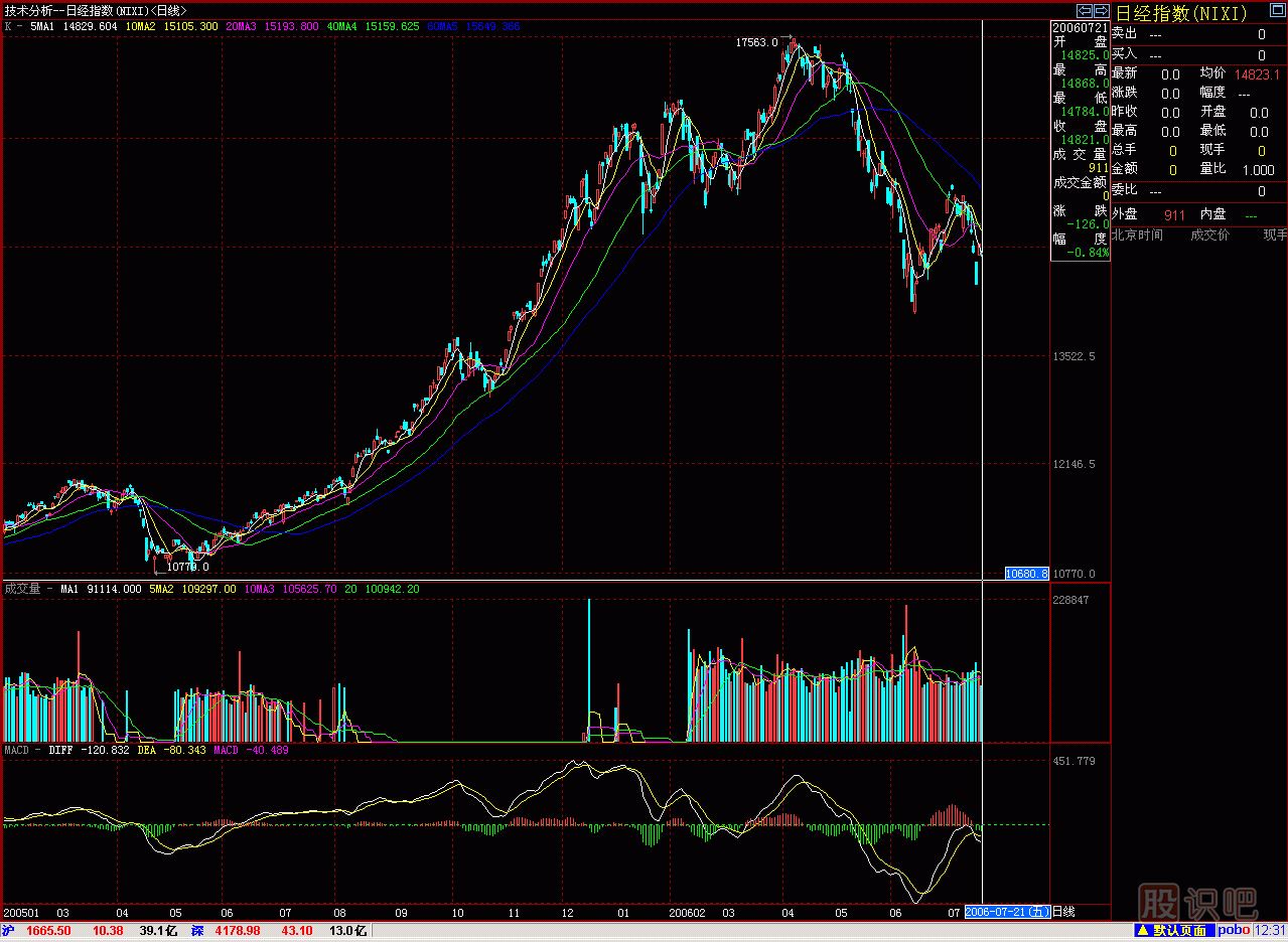 (圖266-3)2006年7月21日檢查預(yù)測效果時,日經(jīng)指數(shù)(NIXI)的日K線圖。其中“大刀砍”和“斷頭鍘刀”的形態(tài)非常標準,實際走勢與(圖266-2)中的H-I-J預(yù)測基本吻合,現(xiàn)在已走K,估計未來還會沿著L-M-N的預(yù)測運行。