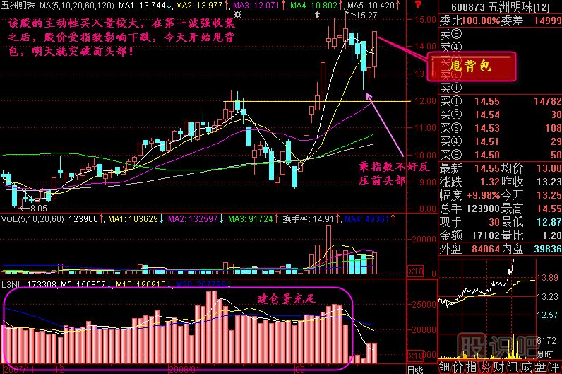 你可以想象,前幾天的幾根k線像是人頭(暫且算是頭),今天的陽線是背包,一旦用力甩出去,也能甩高一段距離。你這樣想,就不覺得股價(jià)高了,反而覺得還能買進(jìn)呢。當(dāng)然,在廣通是可以看到L3能量圖的,該股的L3能量充足,其甩背包后的力量將會(huì)很大。
