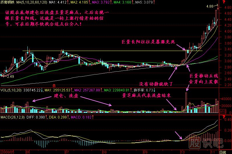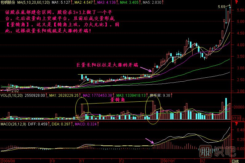 小結(jié):當(dāng)一只股票暴露出莊家建倉(cāng)的痕跡后,一旦放巨量向上突破平臺(tái),則是大漲的開(kāi)端,起碼要走一段路,否則莊家沒(méi)法出貨,這就叫巨量長(zhǎng)陽(yáng)往往是大漲的開(kāi)端。