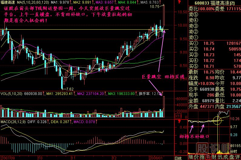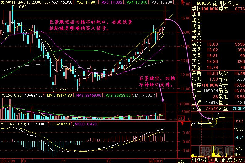 小結(jié):快速買進(jìn)當(dāng)天漲停板技術(shù)的訣竅就是巨量跳空過平臺,回檔不補(bǔ)缺口再度放量拉起過前頭打進(jìn)!簡潔點說就是巨量跳空,回檔買進(jìn)!這八個金光閃閃的大字一定要牢記心頭!
