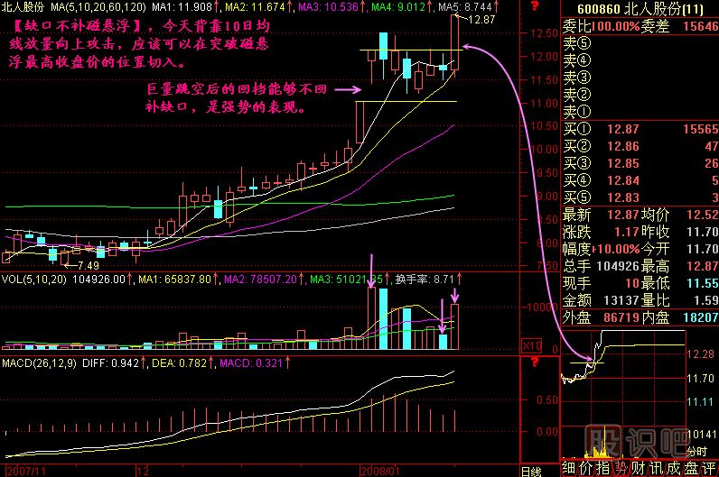 今天開盤股價跳空高開,放出巨量,15分鐘就放出巨量來了,達(dá)到平時一天的成交量,實際上我們只要七八分鐘就可以發(fā)現(xiàn)它,就容易在a點快速切入,很多同學(xué)已經(jīng)很有經(jīng)驗了。開盤——放量——快速切入,這個動作一定要做的熟練,要反復(fù)訓(xùn)練。a點切入實際價位在6.37元,已經(jīng)漲了2%左右,但這不要緊,因為行進(jìn)中的東西是最可信的,它畢竟是在一個小平臺上向上攻擊,你怕什么?它跌下來也不就跌到老地方嗎?