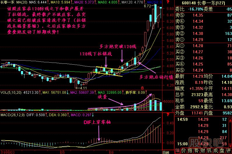 小結(jié):120線下拉鋸戰(zhàn)是散戶消耗戰(zhàn),散戶最終都將在拉鋸戰(zhàn)中戰(zhàn)敗而乖乖交出籌碼,在拉鋸戰(zhàn)末端一般都有量萎縮,說明已經(jīng)達(dá)到莊家洗盤的目的,那么只要后期一根放量陽線突破拉鋸戰(zhàn)壓力線和120防線,行情就啟動了,起碼要漲一段路。
