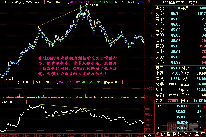 晚上剛剛收到一個(gè)Email,我們在全國的學(xué)員很多,對一些有典型意義的問題我們現(xiàn)在做一個(gè)統(tǒng)一回答。他問中信證券是不是在出貨?有這個(gè)感覺當(dāng)然很好。為了回答這個(gè)問題,我們把中信證券5分鐘K線調(diào)出來,然后分析下邊的OBV指標(biāo),見(圖204-1)所示。