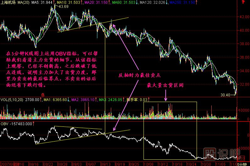 在緩慢派發(fā)時(shí),表面上看,股價(jià)可能是創(chuàng)新高乏力,但如果查看5分鐘OBV能量潮,會發(fā)現(xiàn)能量潮已經(jīng)不能創(chuàng)新高了,而股價(jià)還在創(chuàng)新高。而當(dāng)能量潮跌破低點(diǎn)連線時(shí),就是莊家從維護(hù)股價(jià)出貨的階段,轉(zhuǎn)變到全力出貨的階段那個(gè)臨界點(diǎn),那里就是我們必須撤退的位置,如果你不撤退,小則要吃一個(gè)回檔,損失其它黑馬機(jī)會,大的話可能就是整個(gè)股價(jià)的頭部,很可能因此就套牢了。
