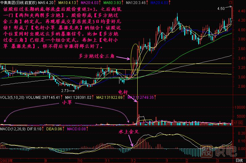 我們總是說,一個股票啟動了,是指什么呢?就是指一根很長的陽線,并且伴隨著很大的成交量。這個成交量要大到什么程度呢?要大到幾倍于5日均量線,目前寶鋼股份的成交量已經(jīng)4倍于5日均量線。成交量還要形成一個什么形態(tài)呢?要像一根電桿一樣豎起來,把以前的成交量都變成小草,即電桿小草這種量的形態(tài),加上一根巨量長陽線,這就是黑馬啟動的標(biāo)志之一。
