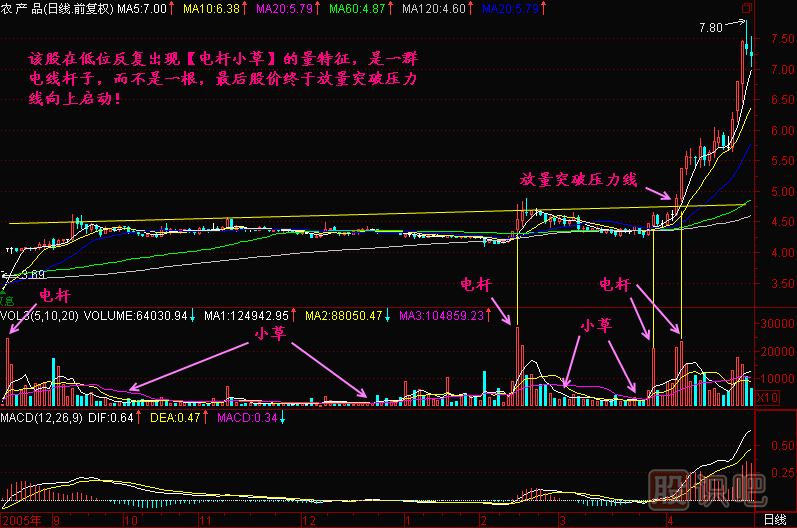 小結(jié):在低位出現(xiàn)電桿小草的成交量特征,往往是莊家大力收集籌碼的表現(xiàn),如果此時正好突破T線或者筷子線等重要壓力線時,則是啟動行情的標(biāo)志!