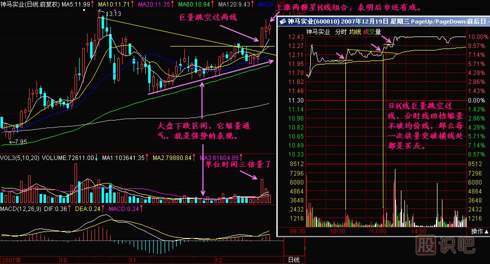 在運用巨量跳空,回檔買進這個技術時還要注意大盤的配合,如果大盤已經展開反彈,那么可以操作,如果大盤正在強有力的下跌通道中運行,那么最好還是放棄。