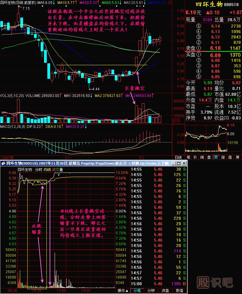 巨量跳空,回檔買進聽起來很簡單,好像誰都能完成,其實不是那么簡單的,它要求你有足夠扎實的各項單一技術功底,要能在短時間內判斷出該股一段時間來的情況,是否具備連續(xù)上漲的條件等等……,這個技術是要多模擬總結才能練好的。