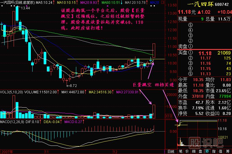 巨量跳空是一個組合條件,它后面的那句話回檔買進也是一個組合條件,具體說就是巨量出現(xiàn)之后的回檔,看情況買進,看什么情況?看回檔是否縮量,看這個回檔最好能不回補跳空缺口,回檔要越淺越好,回檔時量要越小越好,且之后要再次放量向上攻擊,那么這個時點就是一個短線打進點!