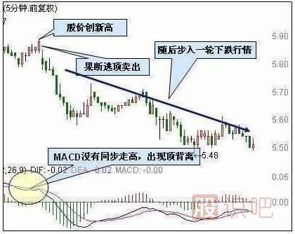 3、5分鐘MACD頂背離。股價(jià)創(chuàng)新高時(shí),MACD沒(méi)有創(chuàng)新高,MACD出現(xiàn)頂背離: