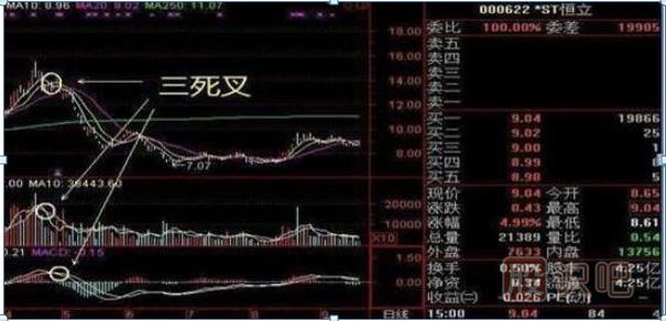 三死叉,也就是說當(dāng)股價(jià)均線、成交量均線、MACD指標(biāo)都出現(xiàn)三死叉的時(shí)候,此時(shí)應(yīng)該果斷賣出。看下圖中的st恒立,出現(xiàn)三死叉后股價(jià)一路下滑。