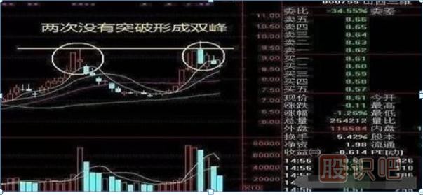 股價(jià)連續(xù)兩次沖擊某個(gè)價(jià)位都出現(xiàn)了回落,K線組合看起來就是兩個(gè)高高的雙峰。像山西三維就是這個(gè)走勢(shì),近期兩次沖擊9.5沒有成功,股價(jià)只能順勢(shì)回落。
