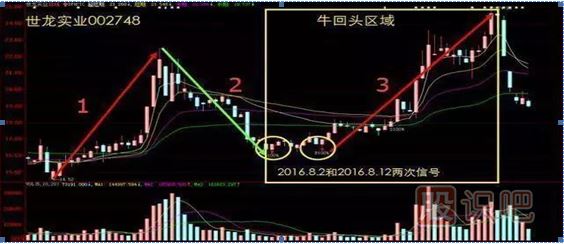 抓不到第一波沒關(guān)系,這種牛股,大多數(shù)人都抓不到第一波,但是我們可以比較容易的抓到第二波或者第三波。圖中2的位置,就是這個股票大幅上漲之后的一個深度調(diào)整,經(jīng)過幾個月的時間后,這個股票又來了第二波上漲行情,而且這第二波不必第一波小。那么在2和3之間就出現(xiàn)了一個?;仡^的機會。就是圖中,兩個黃色圓圈發(fā)出信號的地方,這就是牛回頭。