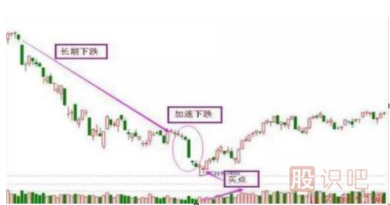 形態(tài)特征:大盤或是個(gè)股在經(jīng)歷長(zhǎng)時(shí)間的下跌之后,會(huì)突發(fā)的出現(xiàn)下跌加速,而后成交量則連續(xù)的增長(zhǎng),這時(shí)候就是大膽買進(jìn)的時(shí)機(jī)。