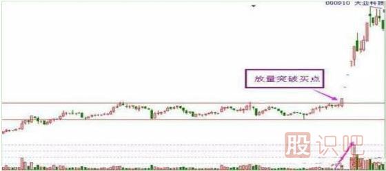 形態(tài)特征:大盤或是個(gè)股在長(zhǎng)時(shí)間下跌之后,會(huì)有一個(gè)橫盤整理的狀態(tài),讓K線形成一個(gè)箱體,當(dāng)?shù)撞吭谙潴w右側(cè)成交量逐步放大,最終突破箱體頂部的時(shí)候就是大膽買進(jìn)的時(shí)候。
