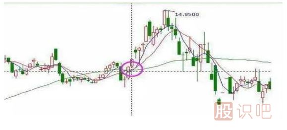 形態(tài)特征:個(gè)股在大幅下調(diào)之后,反彈拉升然后出現(xiàn)縮量回踩,這時(shí)候如果5日均線和10日均線以及40日均線出現(xiàn)三線匯聚,形成金叉,出現(xiàn)再次上攻的跡象,那么就是大膽買進(jìn)的時(shí)候。