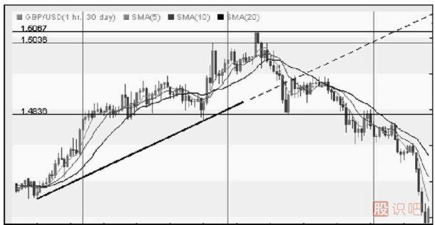 我們注意到,匯價果真下跌,至1.503 6附近,確認(rèn)了2B法則。但是2B法則引發(fā)的是自1.503 6開始的短期下跌走勢(短期反轉(zhuǎn)走勢),具體到匯價自上升趨勢線起始水平開始的主要上升趨勢是否反轉(zhuǎn),則要進(jìn)一步分析。