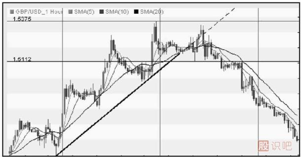 匯價在1.483 6暫停下跌后,主要是受到前期有效低點的支持,出現(xiàn)短期的反彈,但是匯價未能創(chuàng)下新高,不久再次跌破1.483 6低點,123法則形成,這時才完成當(dāng)時圖表(1小時圖)主要方向的反轉(zhuǎn),如圖1-1所示。