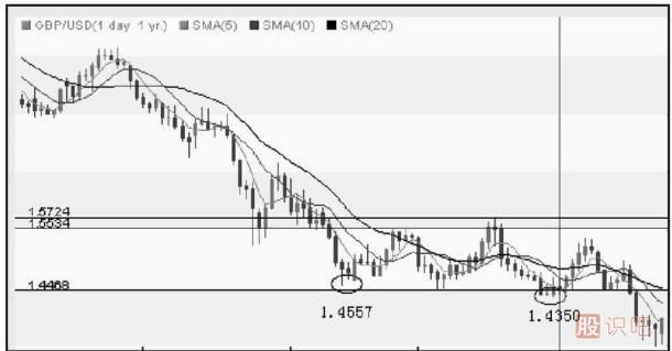 這是我們兩次利用2B法則采取的高賣低買的交易策略,接下來我們?nèi)匀挥欣眠@一法則進(jìn)行交易的機(jī)會。如圖1-2所示,匯價跌至1.435 0低點后,未能進(jìn)一步下跌,在前低1.446 8振蕩4個交易日后,匯價反轉(zhuǎn)上升,此時即可逢低買入,緊設(shè)止損于1.435 0下方,目標(biāo)即是前期反彈高點1.572 4。