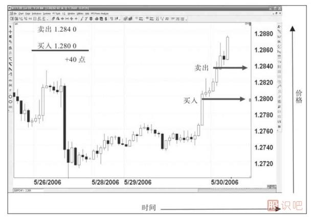 例如,當(dāng)我們?cè)?.2800這個(gè)價(jià)位買入歐元/美元(EUR/USD),或者說我們以1.28美元兌換1歐元的匯率兌換歐元。你會(huì)發(fā)現(xiàn),匯價(jià)向著對(duì)我們有利的方向移動(dòng)至1.2840,在這個(gè)點(diǎn)位我們賣出離場(chǎng),這筆交易的盈利就是40點(diǎn)。為了將點(diǎn)數(shù)換算成美元,請(qǐng)記住,1個(gè)點(diǎn)的點(diǎn)值相對(duì)于1標(biāo)準(zhǔn)手(100000美元)的合約是10美元,相對(duì)于1迷你手(10000美元合約)的點(diǎn)值是1美元。在上面的交易中,我們有40點(diǎn)的盈利,換算下來(lái)就是40×10=400(美元)(交易1標(biāo)準(zhǔn)手)或40×1=40(美元)(交易1迷你手)。