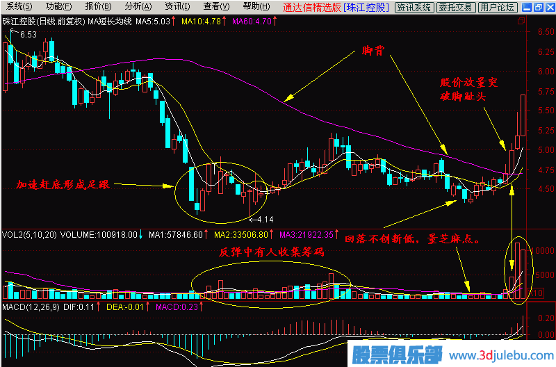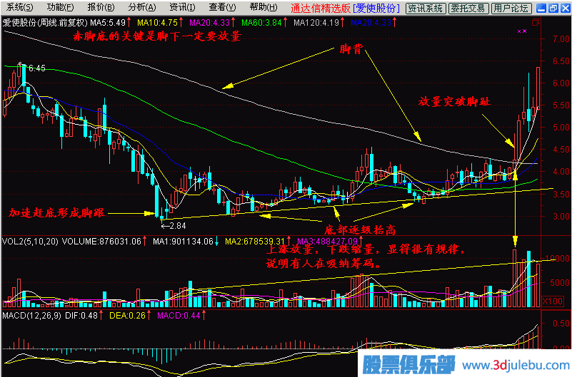 量是關(guān)鍵點(diǎn),量縮放要有規(guī)律,除了腳底要有量,還有突破腳趾頭時(shí)也要放量,還有一個(gè)關(guān)鍵點(diǎn)就是股價(jià)盤整到腳趾頭那個(gè)位置時(shí)必須各種中短期均線幾乎收斂在一起,那才是最有力的腳趾頭,只要有量的配