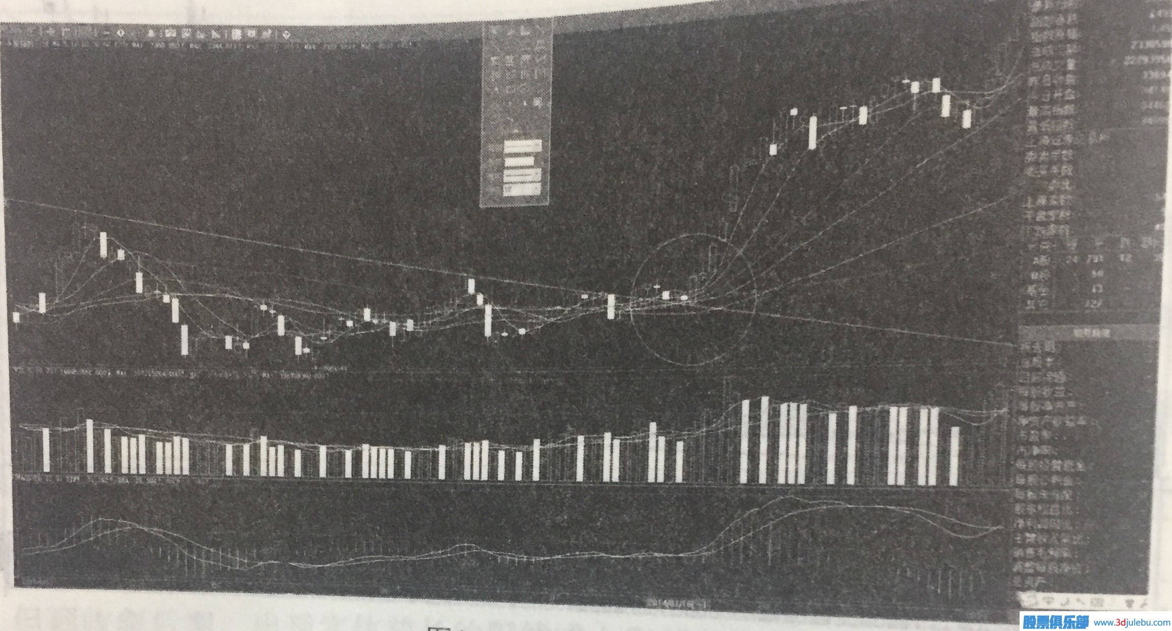 雜亂無章走到多頭發(fā)散。也有人把這樣的形態(tài)稱為“三江匯流”,也是一個很好的買點信號。在圖中,我們又可畫上一根切線,就能看出切線提示的買點信號也在此處。