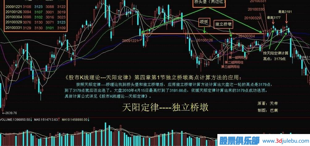 四、下面的圖片就是在2010年4月5日大盤3181點(diǎn)爆炸前我用橋理論在3月31日找出,計(jì)算結(jié)果是3179在3179成功出逃。而且在3179位置計(jì)算出調(diào)整的目標(biāo)位置2315點(diǎn),后來與大盤跌的位置僅僅出差4個(gè)點(diǎn)。其實(shí)我可以把系數(shù)提高,得到的結(jié)果完全可以與點(diǎn)位相同,這樣就有危險(xiǎn)。7年中證明《天陽定律》是戰(zhàn)無不勝的。