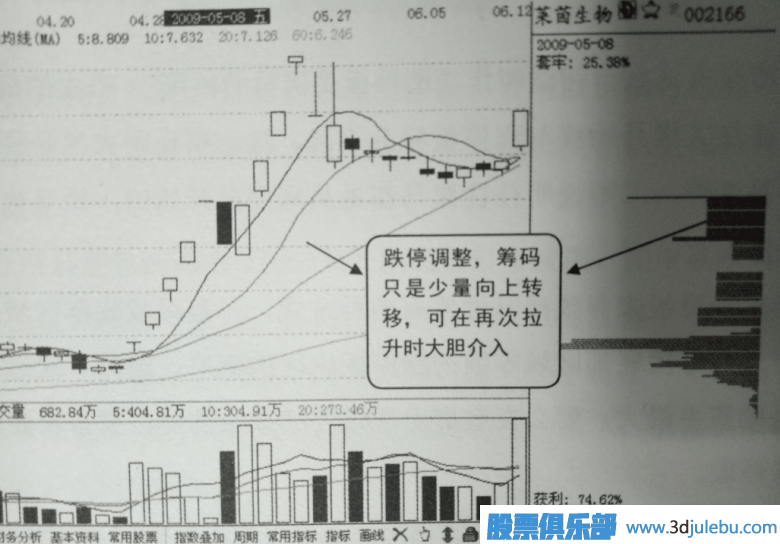 圖中右邊的籌碼分布顯示該股在跌停調(diào)整當(dāng)天大部分籌碼仍然鎖定在股價(jià)底部,因此可判斷出主力此時(shí)并沒(méi)有開(kāi)始真正出貨,進(jìn)一步拉升有望,因此只要籌碼不再向上繼續(xù)快速轉(zhuǎn)移而出現(xiàn)再次拉升則可快速跟進(jìn),結(jié)果如圖所示該股在跌停后隨即不入連續(xù)漲停的走勢(shì),如果能快速跟進(jìn)短線收益非??捎^。