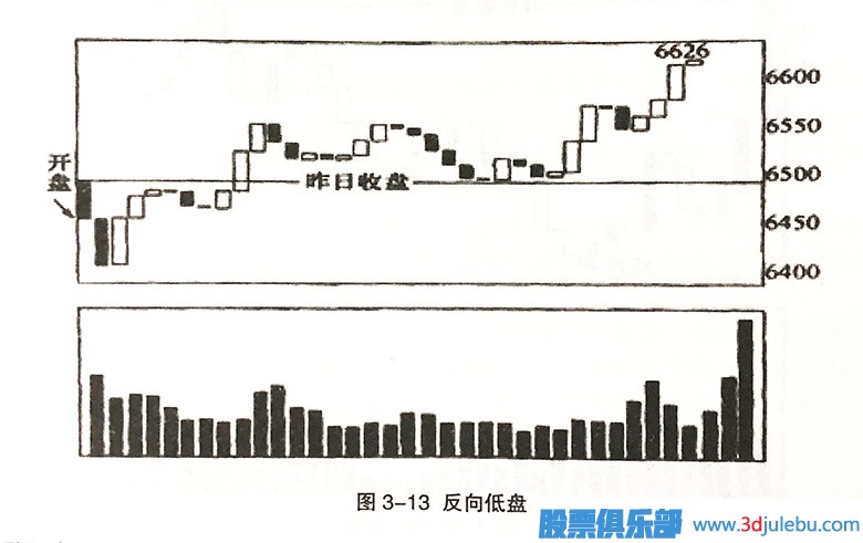 如圖3-9所示,這是一種9:30時指數(shù)以低盤開出,9:40時指數(shù)開盤點低,但9:45時指數(shù)卻出現(xiàn)比9:40時還高的情況。