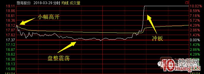 條件:競(jìng)價(jià)小幅高開或平開(低于3%),開盤迅速?zèng)_高(5-10分鐘內(nèi)股價(jià)突破7%),10:00前上板最佳,最好不要晚于10:30。這種分時(shí)圖整體是震蕩攀升格局。