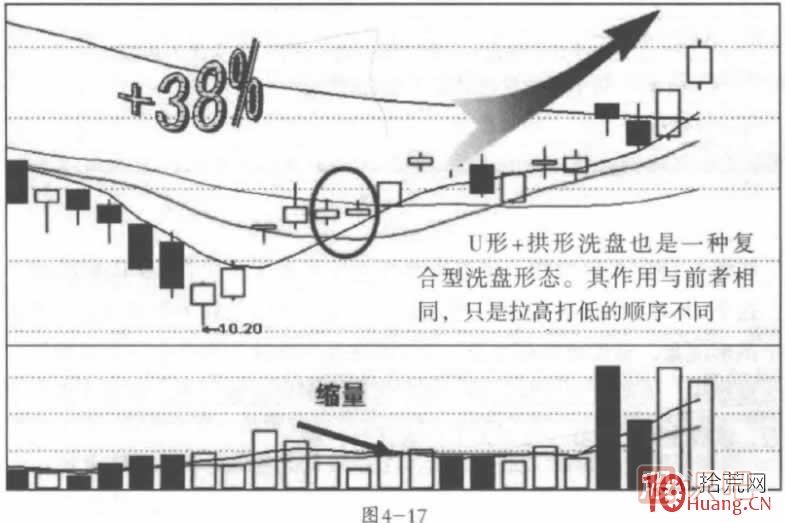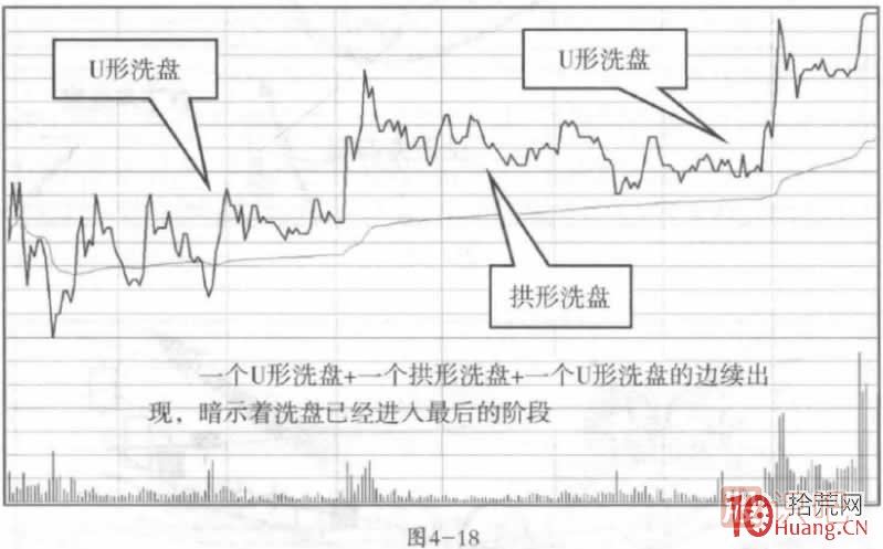 在一些個股的復(fù)合型洗盤走勢中,有時會用兩個U形洗盤+一個拱形洗盤來完成一天的洗盤任務(wù),請看圖4-18