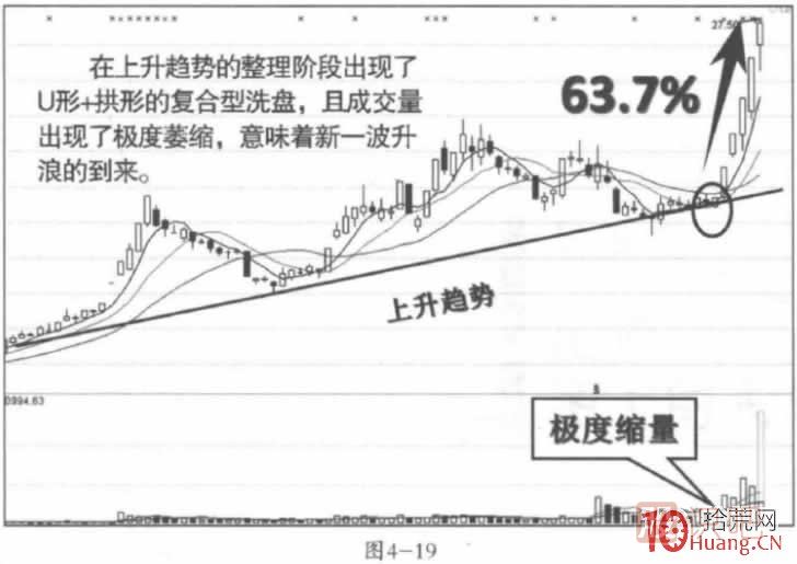 我們從圖4-19中清楚地看到,該股在產(chǎn)生復(fù)合型洗盤的地方是在股價跌到了上升趨勢線之處,趨勢線是切線的一種,具有強烈的支撐或阻力的作用。主力莊家一般都喜歡在這里進(jìn)行洗盤和震倉。圖中顯示,復(fù)合型洗盤成交量已經(jīng)