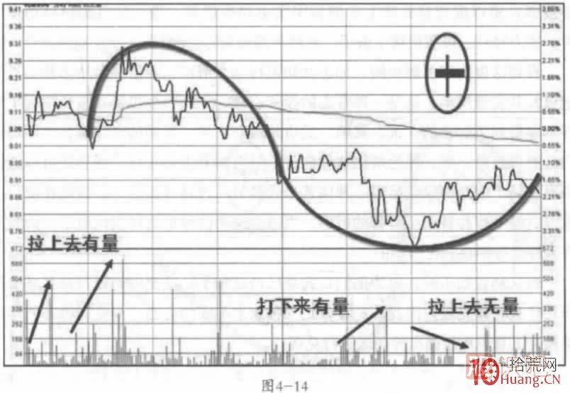 此圖中的分時圖走勢與前一張圖中的正好相反,是一種先U形后拱形的復(fù)合型洗
