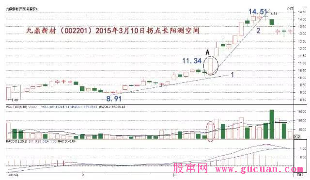 圖2 中,九鼎新材(002201)日線走勢(shì),在2015 年3 月10 日走出顯著放量漲停長(zhǎng)陽(yáng)線(A 處)。此時(shí),我們即可認(rèn)定該線體,就是上升趨勢(shì)的加速拐點(diǎn)。然后積極買進(jìn),止損位就設(shè)在長(zhǎng)陽(yáng)線的實(shí)體下沿,即開盤價(jià)位置。隨后,進(jìn)行波段上漲幅度預(yù)估。波段行情的低點(diǎn)8.91 元,拐點(diǎn)長(zhǎng)陽(yáng)線的收盤價(jià)11.34 元,然后帶入公式M=C2/L 中,即可得到測(cè)算結(jié)果: