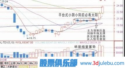 百日地量選股公式告訴你股票將要大漲的幾種股票形態(tài)圖一:平臺式小陰小陽后必有大陽此類圖形一般出現(xiàn)在底部啟動浪階段,或者是在上升趨中途休整期間,如果是在高位或頂部謹慎使用。...