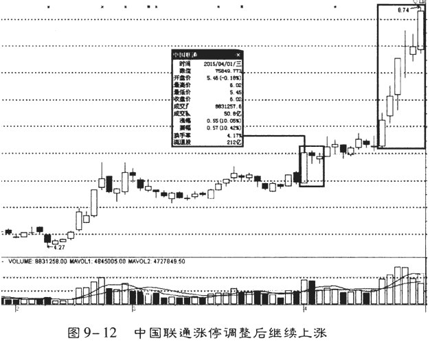 例如,中國(guó)聯(lián)通2015年4月1日出現(xiàn)漲停后股價(jià)進(jìn)入短暫的調(diào)整期,經(jīng)過約兩周的調(diào)整后股價(jià)一路飆升,如圖9-12所示。