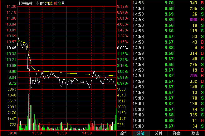 破位大陰線分時(shí)圖:開(kāi)盤(pán)低開(kāi)低走。然后全天保持箱型震蕩,收盤(pán)幾乎收在全天最低價(jià)。兩個(gè)細(xì)節(jié)引起注意:尾盤(pán)出現(xiàn)了一個(gè)大買(mǎi)單;最后一分鐘收盤(pán)價(jià)從17.9收到了17.99元。
