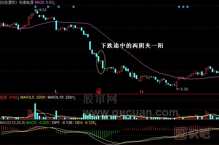 當(dāng)兩陰夾一陽(yáng)出現(xiàn)在下以趨勢(shì)中時(shí),對(duì)股價(jià)有助跌的作用,表示后市繼續(xù)看跌。