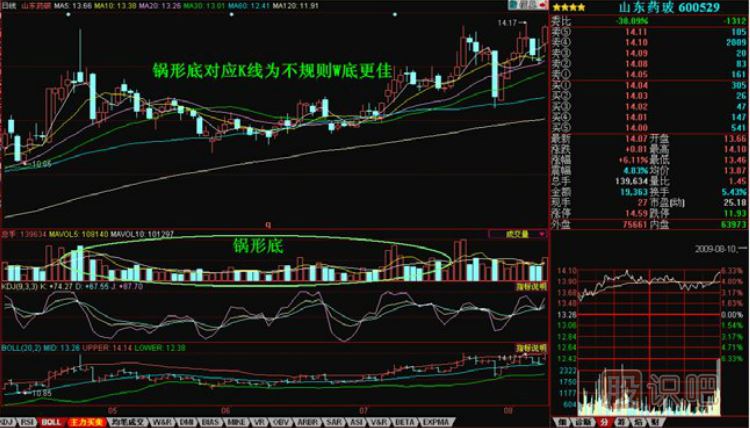 2、鍋形對(duì)應(yīng)的K線形態(tài)為不規(guī)則較淺的w底,量形合一;