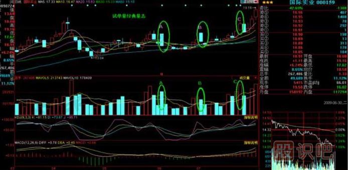 技術(shù)特征:試盤量經(jīng)典量態(tài),試盤量發(fā)生在兩個(gè)位置,一處為循環(huán)低位區(qū),股價(jià)為準(zhǔn)備上漲前的暖身運(yùn)動(dòng),稱為低位試盤量;另一處發(fā)生在股價(jià)漲升一段時(shí)間之后,股價(jià)處于高位整理軋尚未明顯走弱,呈現(xiàn)成交量能逐漸增加現(xiàn)象,稱為高位試單量。試盤量發(fā)生之后往往伴隨攻擊型量能的啟動(dòng)。正如:小荷才露尖尖角的試盤量發(fā)生后,隨后攻擊量的到來(lái),必將催生股價(jià)映日荷花別樣紅。下面討論低位試盤量。發(fā)生在2次試盤量之后常為變盤點(diǎn)。試盤量如下圖國(guó)際實(shí)業(yè)(000159)標(biāo)示A、B、C處。