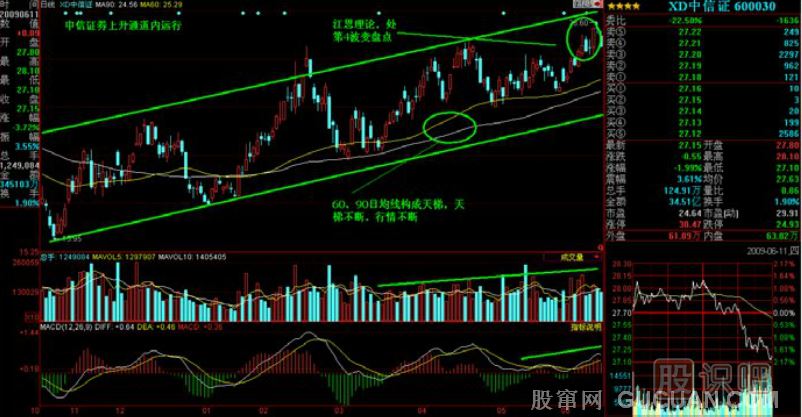 趨勢(shì)投資是投資理論的最最重要核心,是技術(shù)分析要駕馭和把握的對(duì)象。上升或下降通道就是最常見(jiàn)的趨勢(shì)之一。目前我們觀(guān)察到很多個(gè)股處在開(kāi)往春天列車(chē)的上升通道內(nèi),用通道理論挖掘潛力股是捕捉前期滯脹的尤其一些藍(lán)籌較好的實(shí)戰(zhàn)方法。結(jié)合中信證券(如圖)進(jìn)行分析: